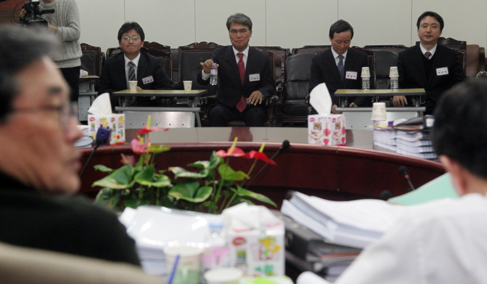 새누리당이 26일 오전 서울 여의도 당사에서 20대 총선 대구·경북 지역 공천 신청자 면접을 실시하는 가운데 유승민 전 원내대표(왼쪽부터)와 이재만, 최성덕, 허진영 예비후보가 대구 동구을 지역 공천 면접에서 이한구 공천관리위원장을 바라보고 있다.