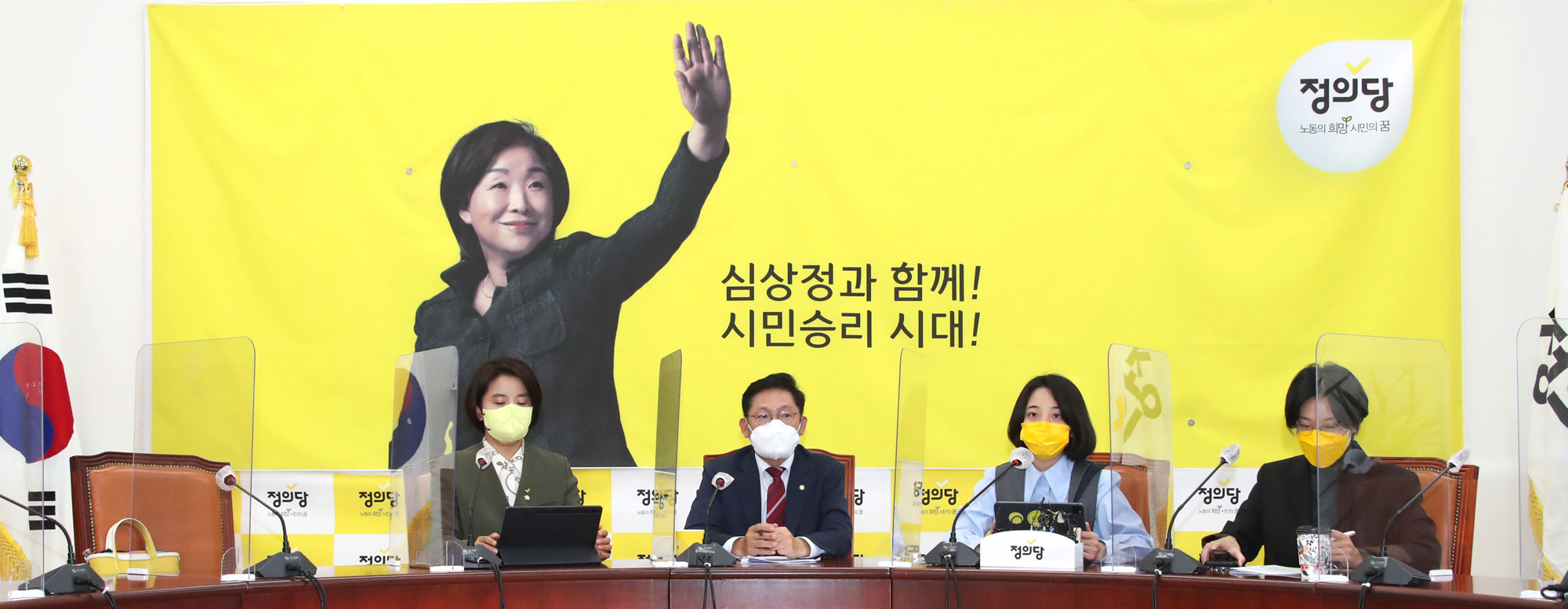 배진교 정의당 원내대표(왼쪽두번째)가 2일 국회에서 열린 의원총회에서 발언하고 있다.