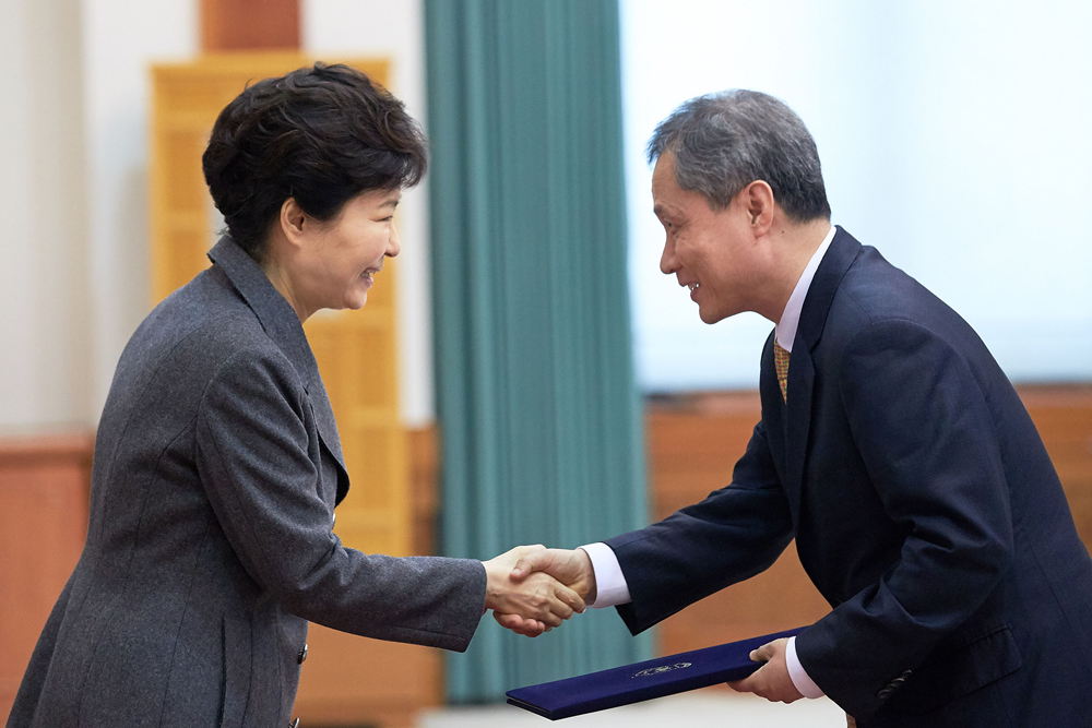 박근혜 대통령이 29일 오후 청와대에서 열린 신임 장·차관급 임명장 수여식에서 김상규 감사위원에게 임명장을 수여한 후 악수하고 있다.