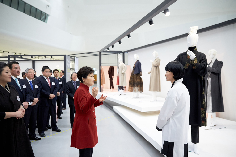 박근혜 대통령이 2일 오후 서울 동대문디자인플라자에서 열린 한국문화 및 우수문화상품 전시회 개막식을 마치고 나서 한복에 대해 설명을 듣고 있다.