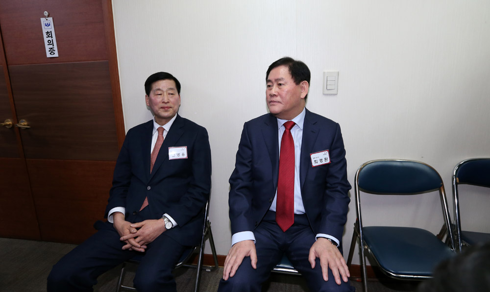 최경환 새누리당 의원이 6일 오후 서울 여의도 당사에 마련된 공천심사 면접장 앞에서 안병용 경북 경산시 예비후보와 대기하고 있다. 2016.3.6/뉴스1