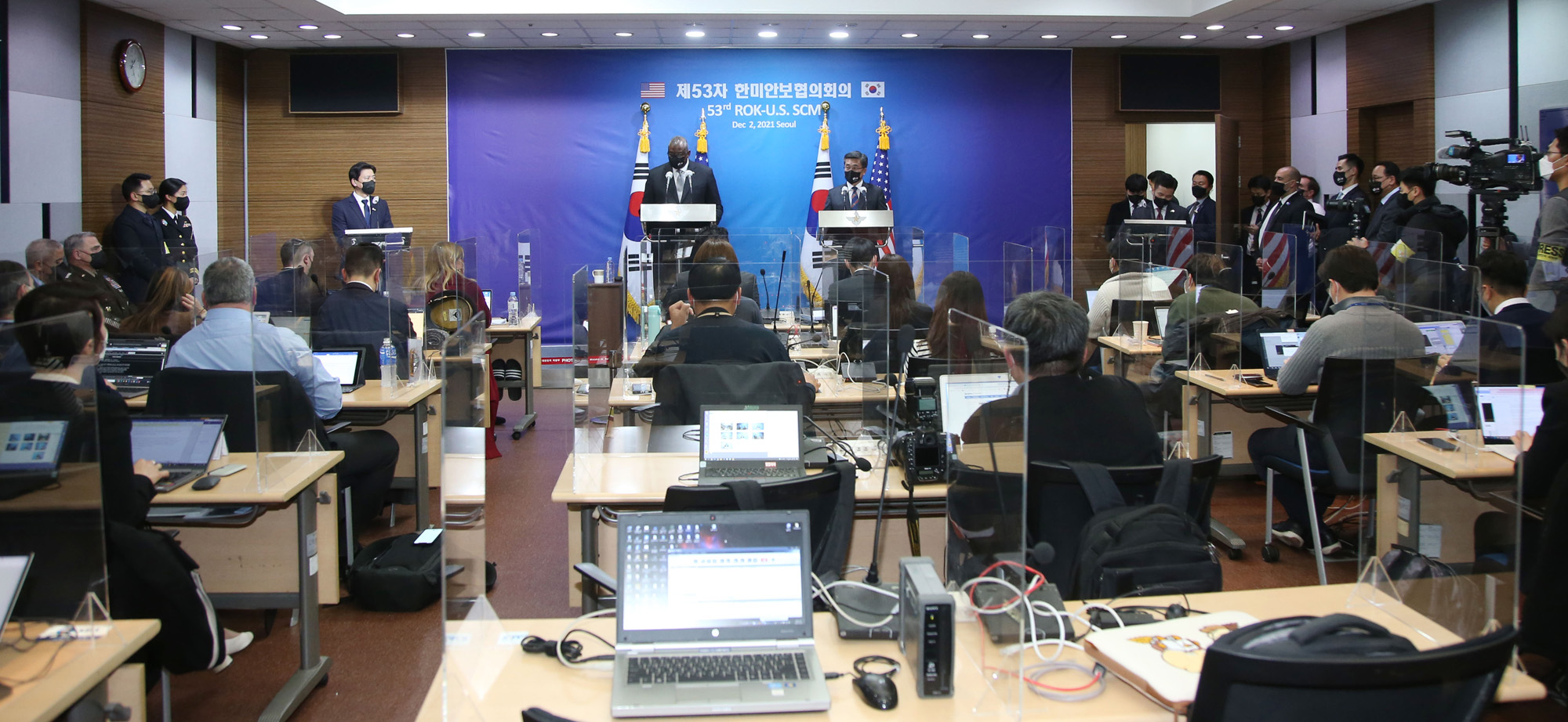 로이드 오스틴 미국 국방부 장관과 서욱 국방부장관이 2일 오후 서울 용산구 국방부 청사 브리핑룸에서 열린 제53차 한·미 한미안보협의회(SCM) 공동기자회견에참석하고 있다. 2021.12.02 사진공동취재단 (협회)