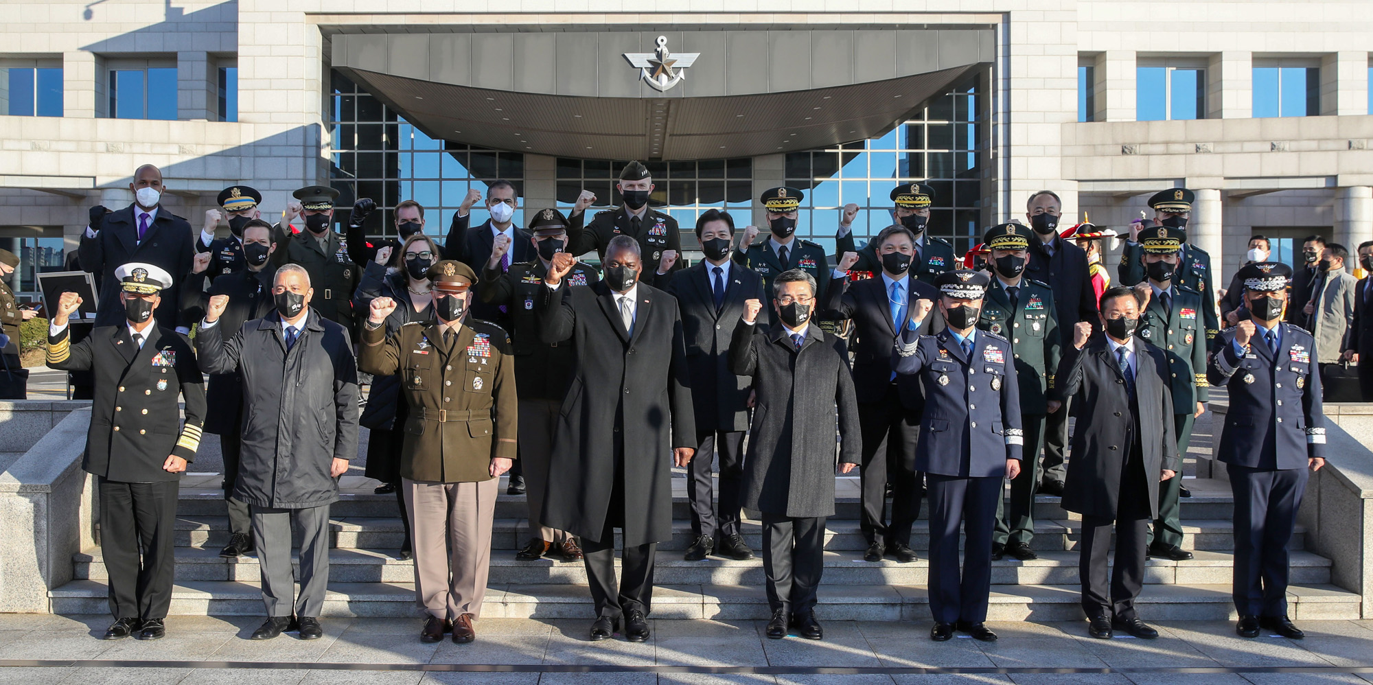 제53차 한·미안보협의회의(SCM)가 2일 서울 용산구 국방부에서 열렸다. 이날 회의에 앞서 열린 의장행사에서 서욱 국방부장관(앞줄 왼쪽 다섯째)과 로이드 오스틴 미국 국방부 장관(앞줄 왼쪽 넷째이 기념사진을 찍고 있다. 2021.12.02 사진공동취재단(협회)