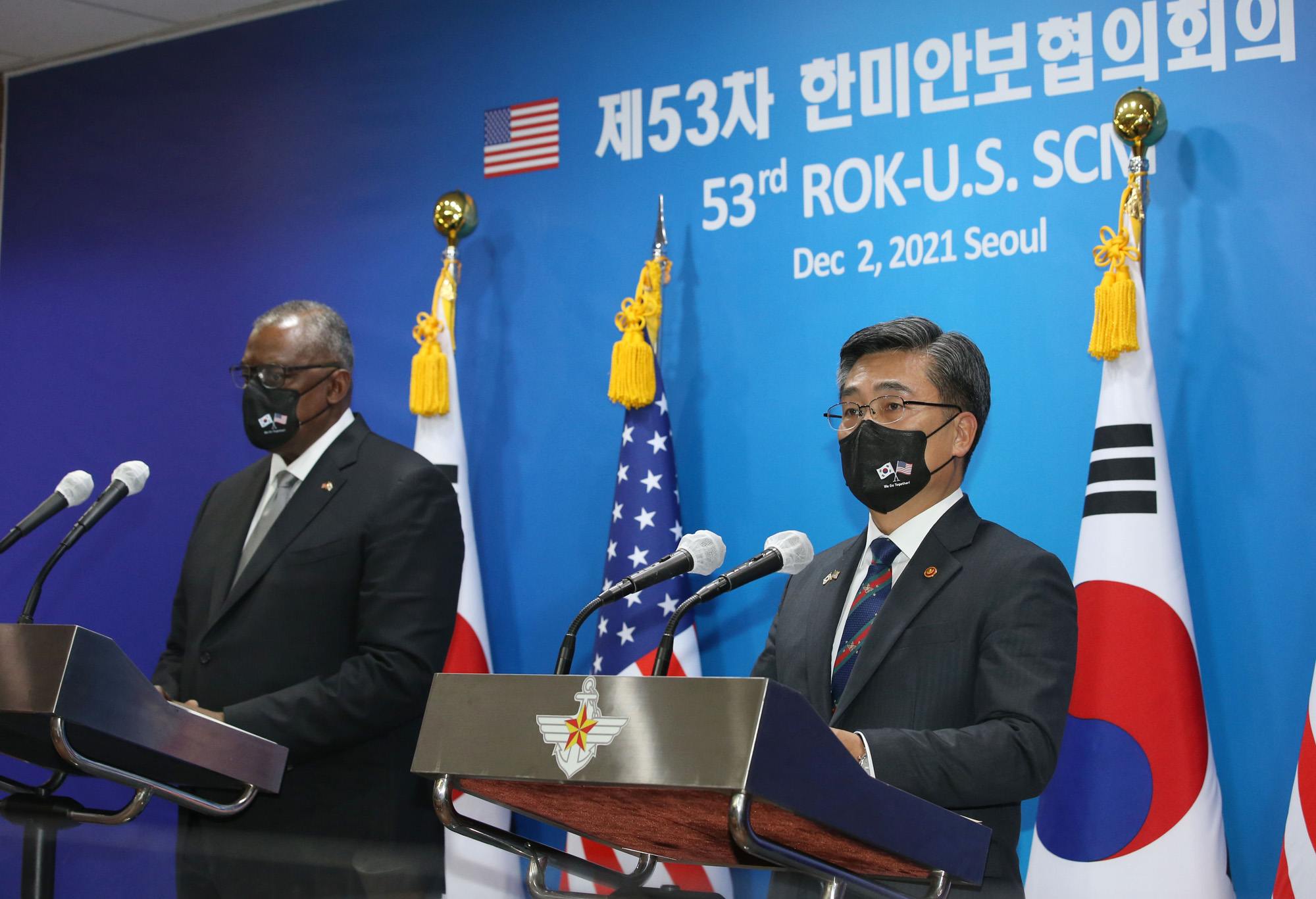 로이드 오스틴 미국 국방부 장관과 서욱 국방부장관이 2일 오후 서울 용산구 국방부 청사 브리핑룸에서 열린 제53차 한·미 한미안보협의회(SCM) 공동기자회견에참석하고 있다. 2021.12.02 사진공동취재단 (협회)