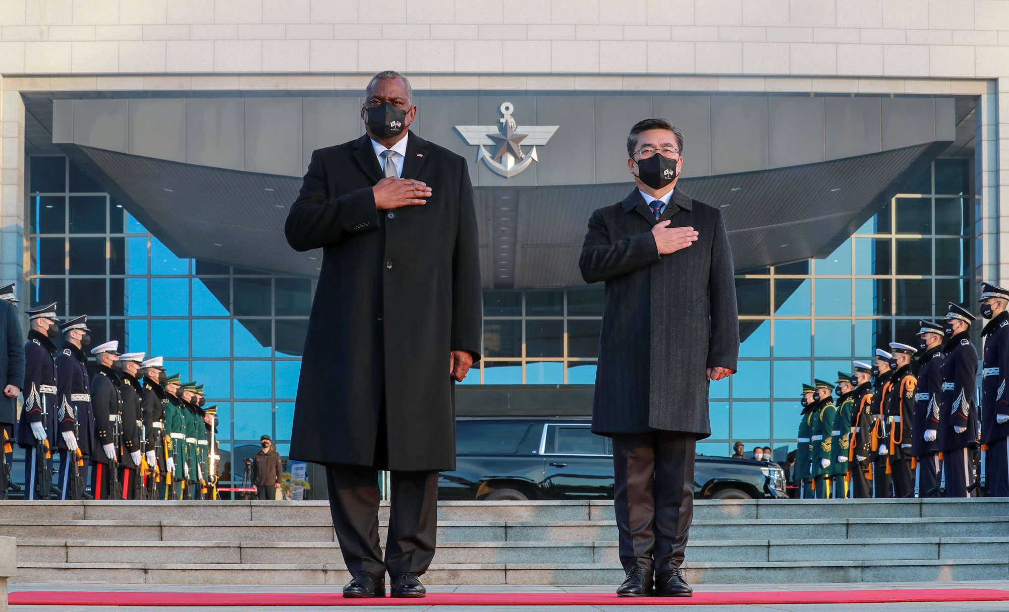 제53차 한·미안보협의회의(SCM)가 2일 서울 용산구 국방부에서 열렸다. 이날 회의에 앞서 열린 의장행사에서 서욱 국방부장관(오른쪽)과 로이드 오스틴 미국 국방부 장관(왼쪽)이 경례하고 있다. 2021.12.02 사진공동취재단(협회)