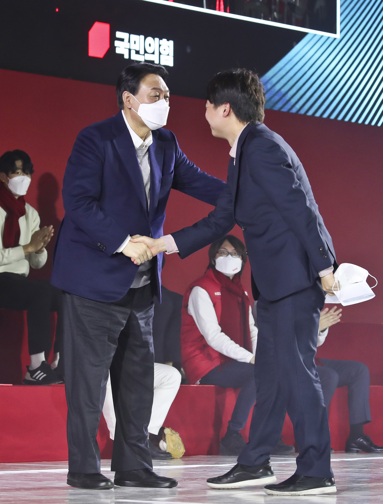 국민의힘 윤석열 대선 후보와 이준석 대표가 6일 서울 송파구 올림픽공원 체조경기장에서 열린 국민의힘 제20대 대통령선거 선거대책위원회 출범식에서 악수를 하고 있다.