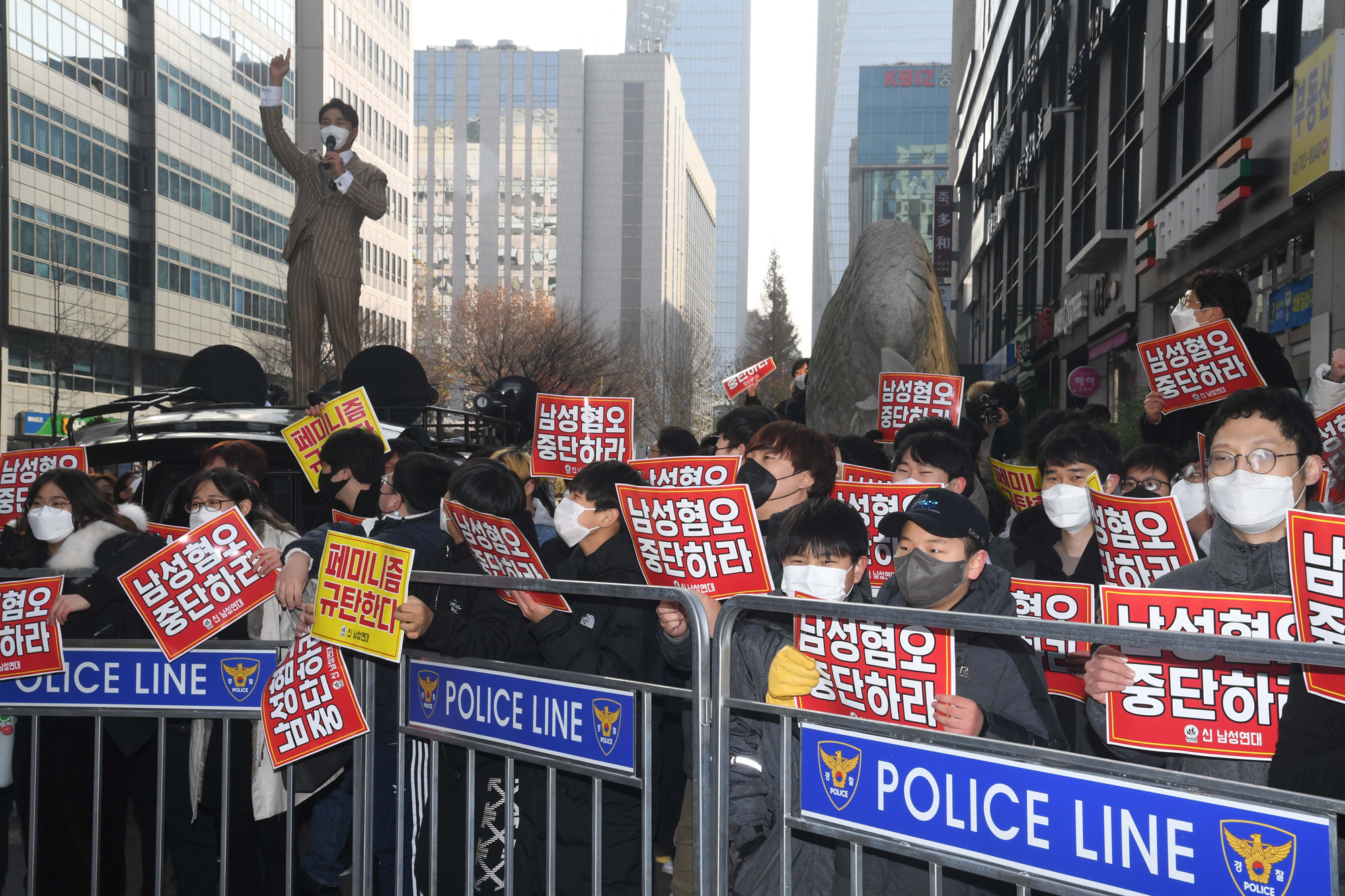 12일 오전 서울 여의도에서 국민의힘 당사 앞에서 여성단체인 '샤우트 아웃'이 '여성혐오'를 규탄하는 집회를 열자 인근에서 신남성연대가 주최한 '페미니즘 규탄' 집회가 열리고 있다. 2021.12.12. 국회사진취재단