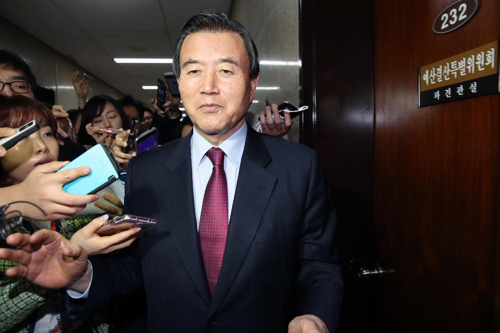 새누리당 최고위원회의가 16일 오전 국회에서 비공개로 열렸다. 홍문표 의원이 회의 도중 회의장 밖으로 나왔다 기자들의 질문을 받고 있다.