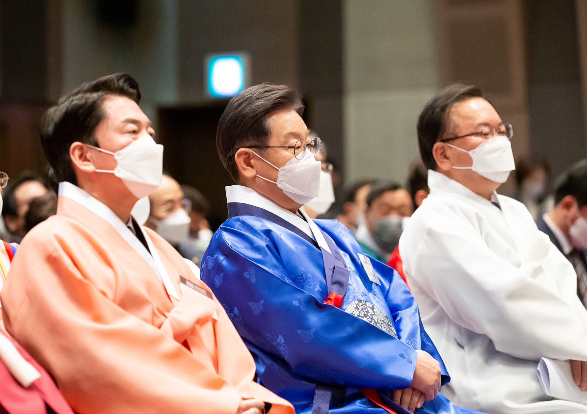 17일 더불어민주당 이재명대선후보가 윤석열 후보와 함께 서울 프레스센터에서 열린 재경대구경북인 신년교례회에 참석하고 있다.