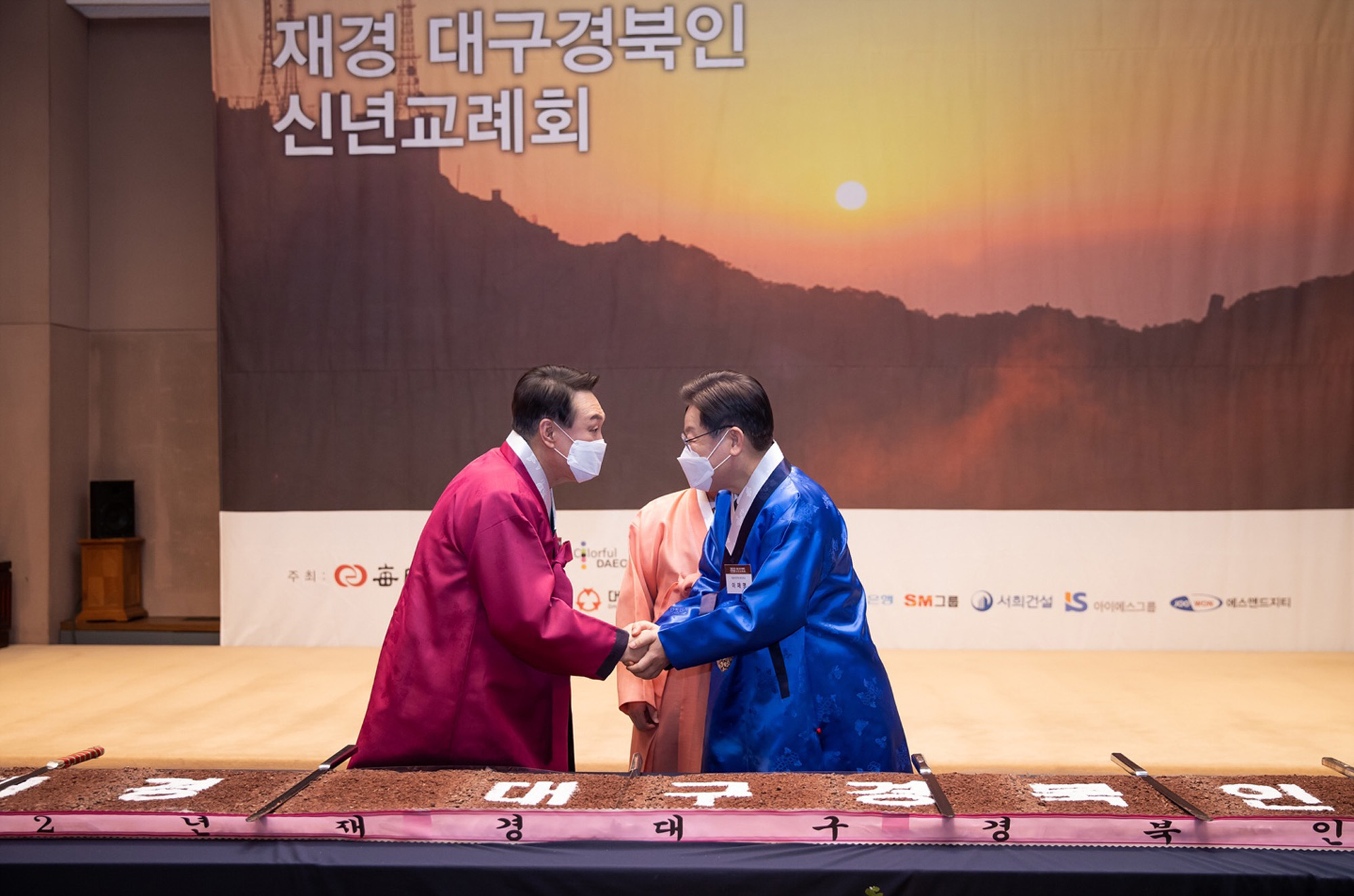 17일 더불어민주당 이재명대선후보가 윤석열 후보와 함께 서울 프레스센터에서 열린 재경대구경북인 신년교례회에 참석하고 있다.