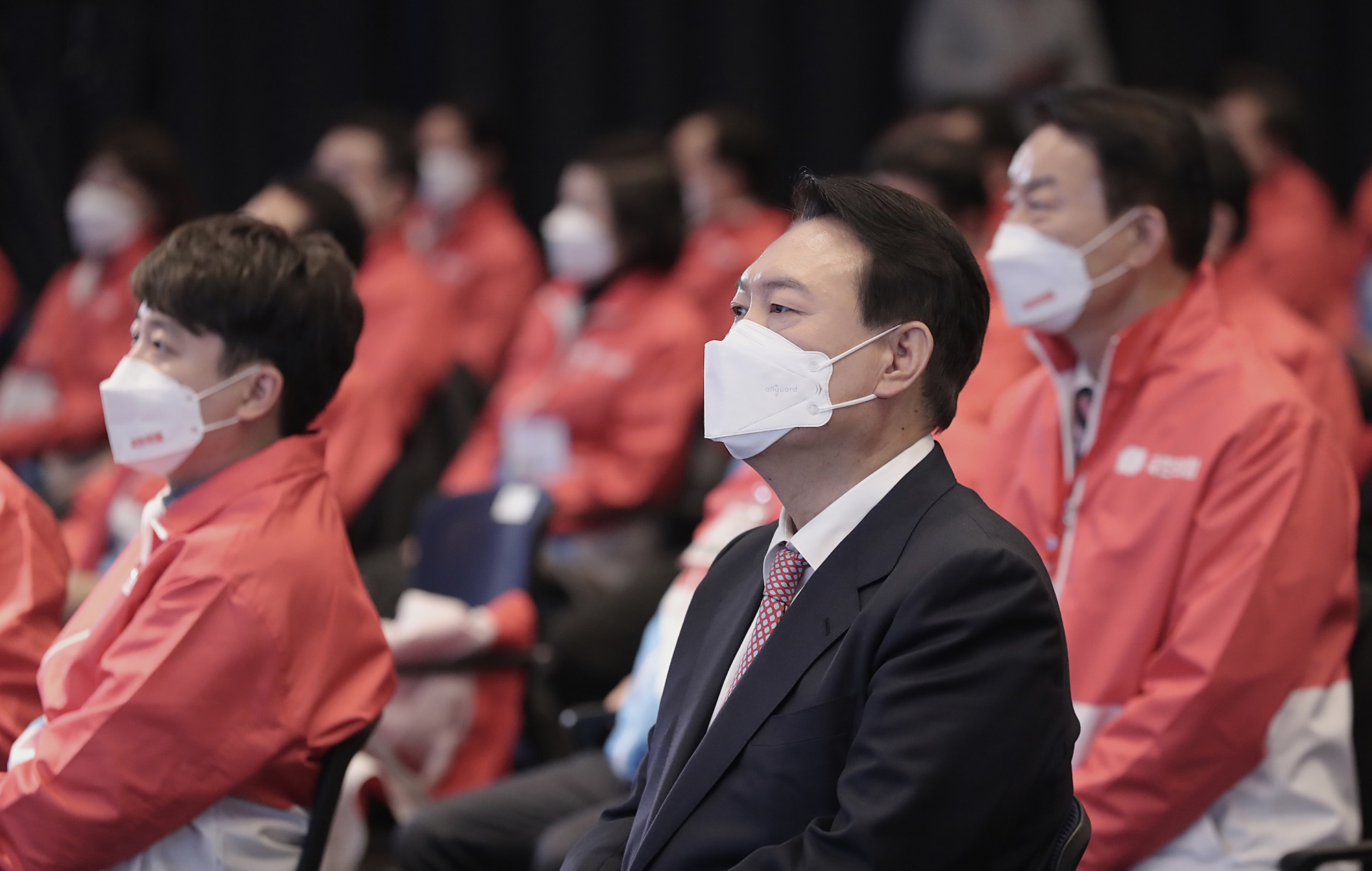 26일 오전 국민의힘 윤석열 대선후보가 여의도 중소기업중앙회 KBIZ홀에서 열린 "우리가 윤석열이다!" 국회의원 및 원외당협위원장 필승결의대회 참석하고 있다.