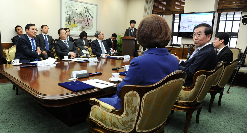 22일 박원순 서울시장과 이화여대,서강대,연세대,홍익대 총장을 비롯해 서울시 관계 실국본부장과 4개 대학 산학협력단장이 참석한 가운데 '청년일자리 창출 및 지역 활성화를 위한 공동협약'을 체결하고 있다. 서울시 제공