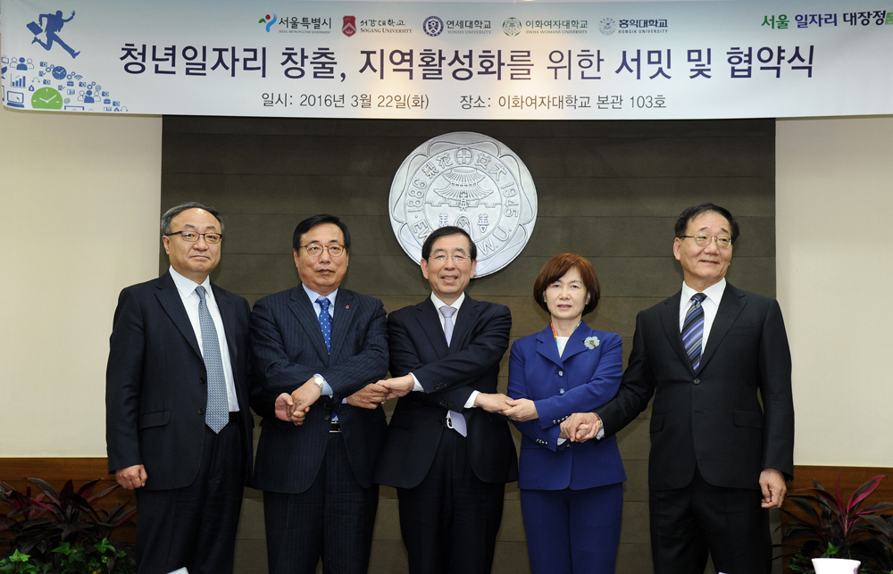 22일 박원순 서울시장과 이화여대,서강대,연세대,홍익대 총장을 비롯해 서울시 관계 실국본부장과 4개 대학 산학협력단장이 참석한 가운데 '청년일자리 창출 및 지역 활성화를 위한 공동협약'을 체결하고 있다. 서울시 제공