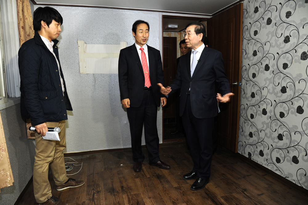 박원순 서울시장과 4개 대학 총장들이 22일 오후 서울 서대문구 이화여대 인근 이화 스타트업 52번가를 방문해 설명을 듣고 있다. 서울시 제공