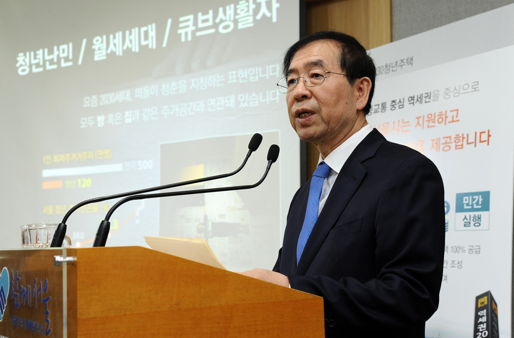 박원순 서울시장이 23일 오전 서울시청 신청사에서 역세권 2030 주택공급방안 기자설명회를 하고 있다. 서울시 제공