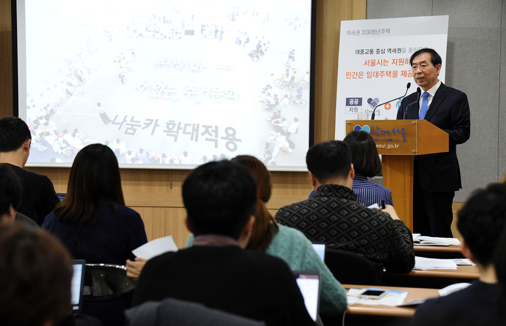 박원순 서울시장이 23일 오전 서울시청 신청사에서 역세권 2030 주택공급방안 기자설명회를 하고 있다. 서울시 제공