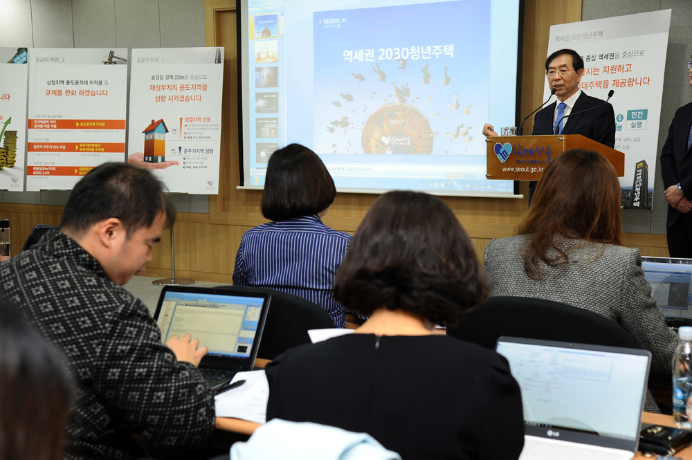 박원순 서울시장이 23일 오전 서울시청 신청사에서 역세권 2030 주택공급방안 기자설명회를 하고 있다. 서울시 제공