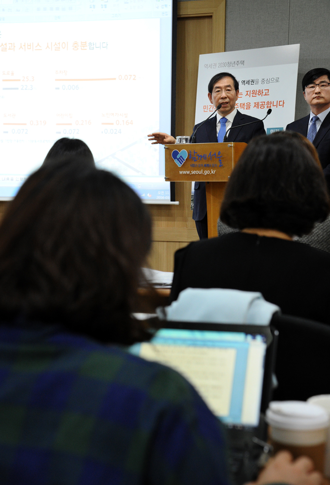 박원순 서울시장이 23일 오전 서울시청 신청사에서 역세권 2030 주택공급방안 기자설명회를 하고 있다. 서울시 제공