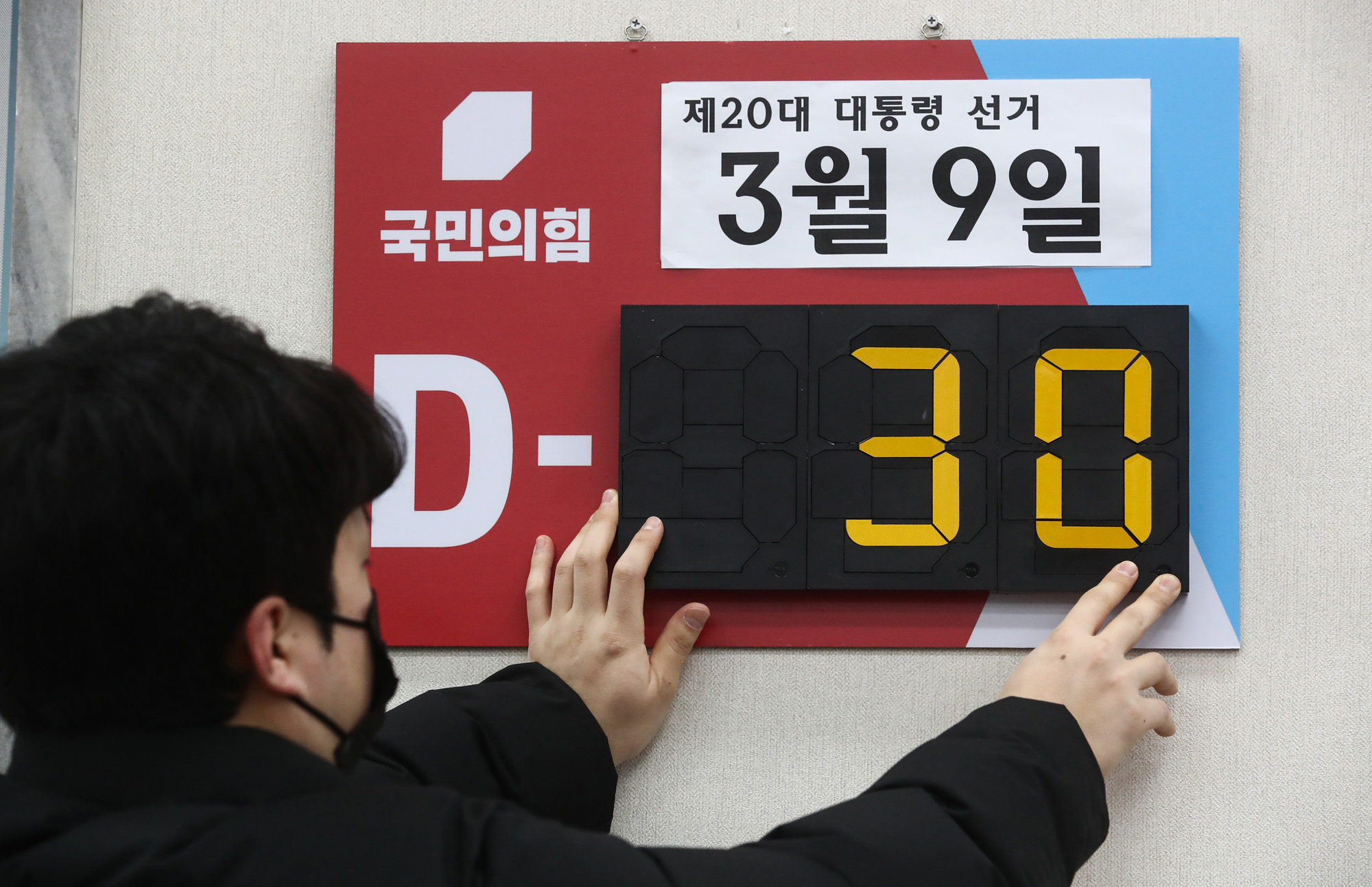 제20대 대통령선거가 한 달 여 앞으로 다가온 가운데 6일 국회 국민의힘 회의실에서 당직자가 대선 디데이 알림판을 교체하고 있다. 2022.02.06. 국회사진취재단