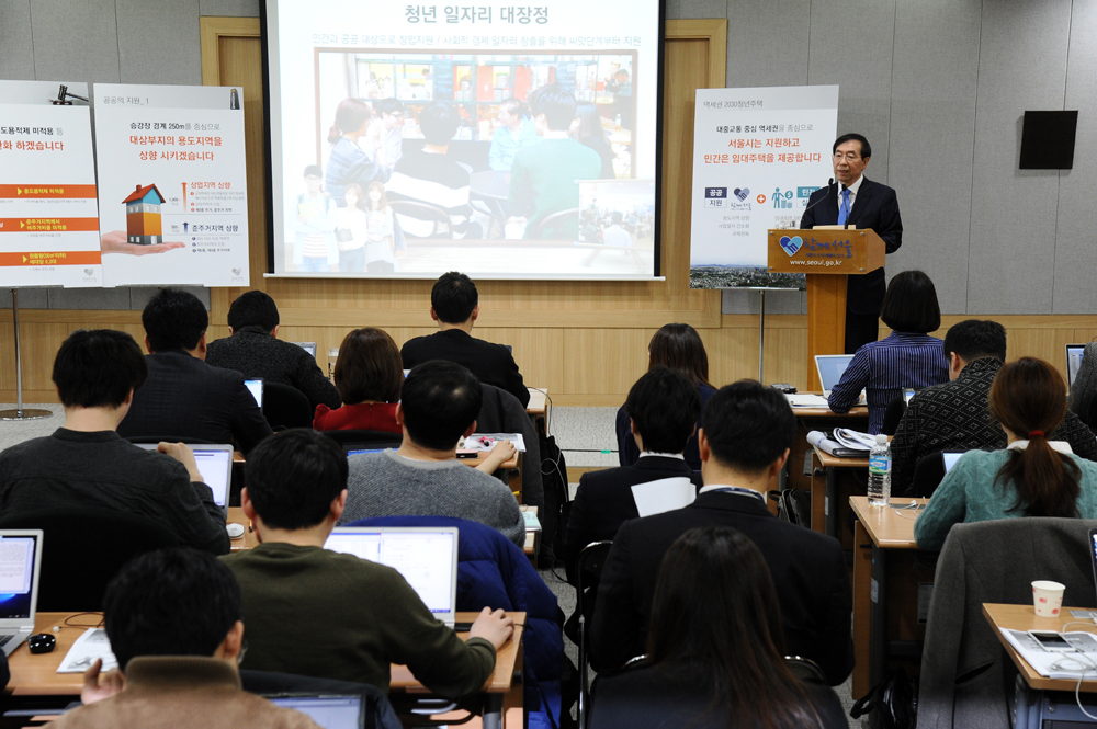 박원순 서울시장이 23일 오전 서울시청 신청사에서 역세권 2030 주택공급방안 기자설명회를 하고 있다. 서울시 제공