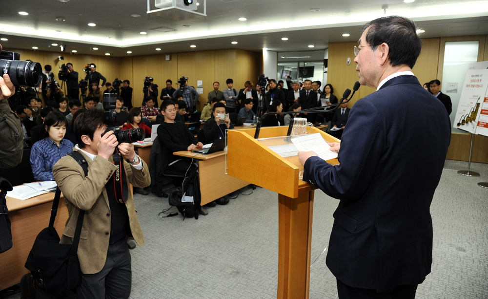 박원순 서울시장이 23일 오전 서울시청 신청사에서 역세권 2030 주택공급방안 기자설명회를 하고 있다. 서울시 제공