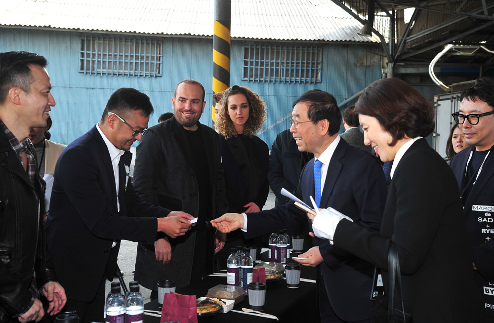 박원순 서울시장이 23일 서울 영등포구 문래동 대선제분에서 진행 중인 ‘제너레이션 넥스트 서울’ 트레이드 쇼 행사장을 방문해 모델 장윤주와 함께 참여 업체 부스를 둘러보고 있다. 서울시 제공