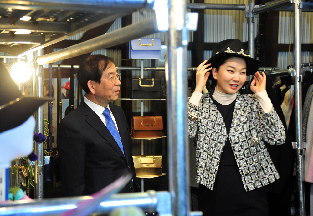 박원순 서울시장이 23일 서울 영등포구 문래동 대선제분에서 진행 중인 ‘제너레이션 넥스트 서울’ 트레이드 쇼 행사장을 방문해 모델 장윤주와 함께 참여 업체 부스를 둘러보고 있다. 서울시 제공