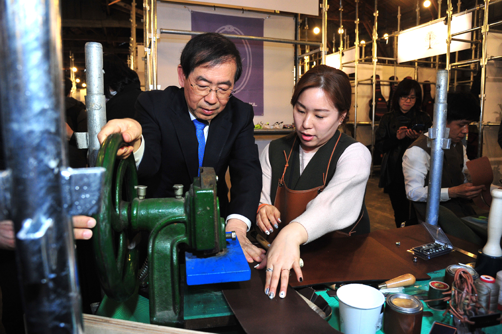 박원순 서울시장이 23일 서울 영등포구 문래동 대선제분에서 진행 중인 ‘제너레이션 넥스트 서울’ 트레이드 쇼 행사장을 방문해 모델 장윤주와 함께 참여 업체 부스를 둘러보고 있다. 서울시 제공