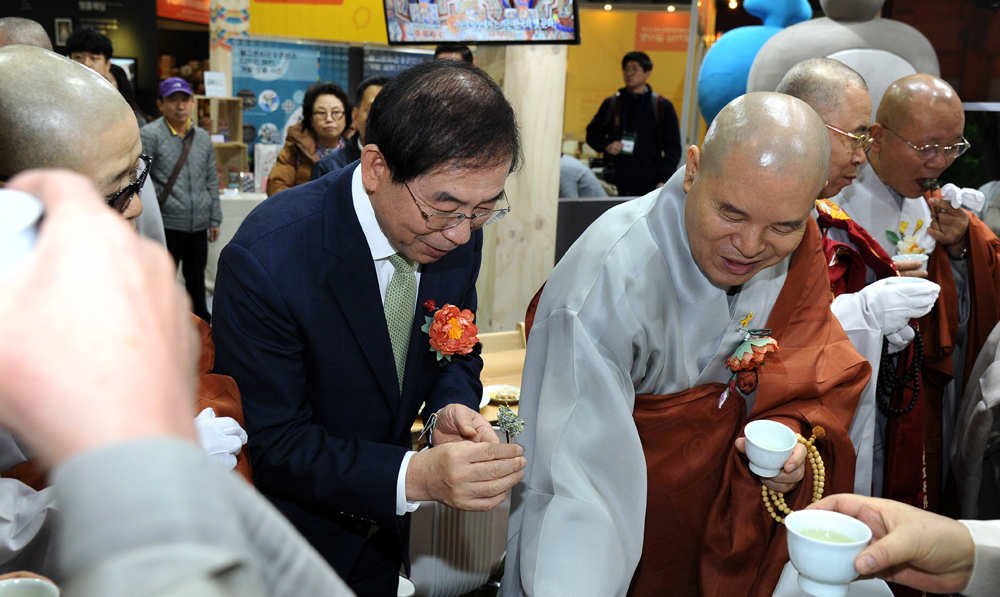 24일 박원순 서울시장이 서울 강남구 무역전시컨벤션센터(SETEC)에서 열린 2016 서울국제불교박람회를 둘러보고 있다. 서울시 제공