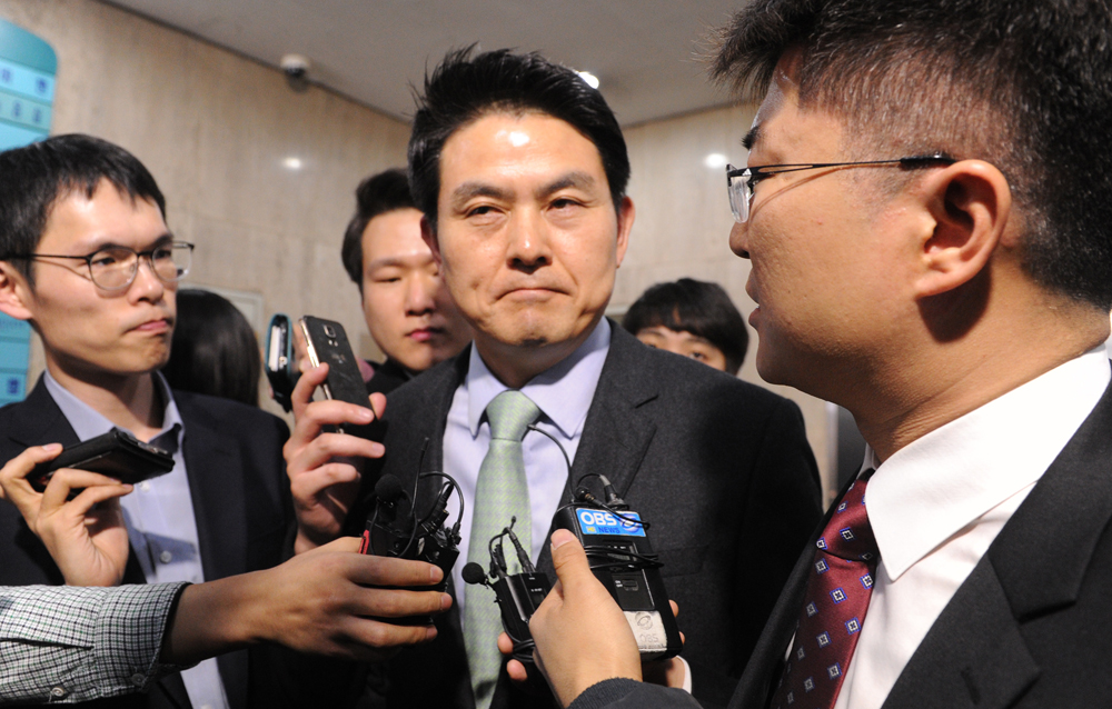 새누리당 김태호 최고위원이 25일 오후 서울 여의도 당사에서 열린 최고위원회의에 참석한 뒤 나오며 취재진 질문에 답변하고 있다.