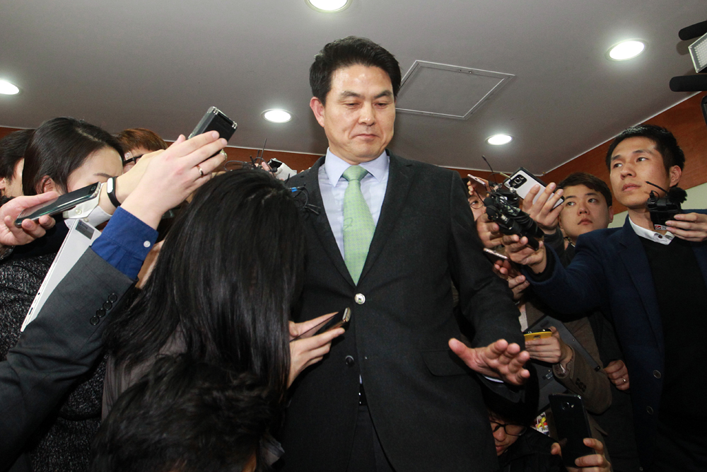 새누리당 김태호 최고위원이 25일 오후 여의도 당사에서 열린 긴급 최고위원회의를 마치고 회의장 밖으로 나서며 취재진의 질문을 받고 있다.