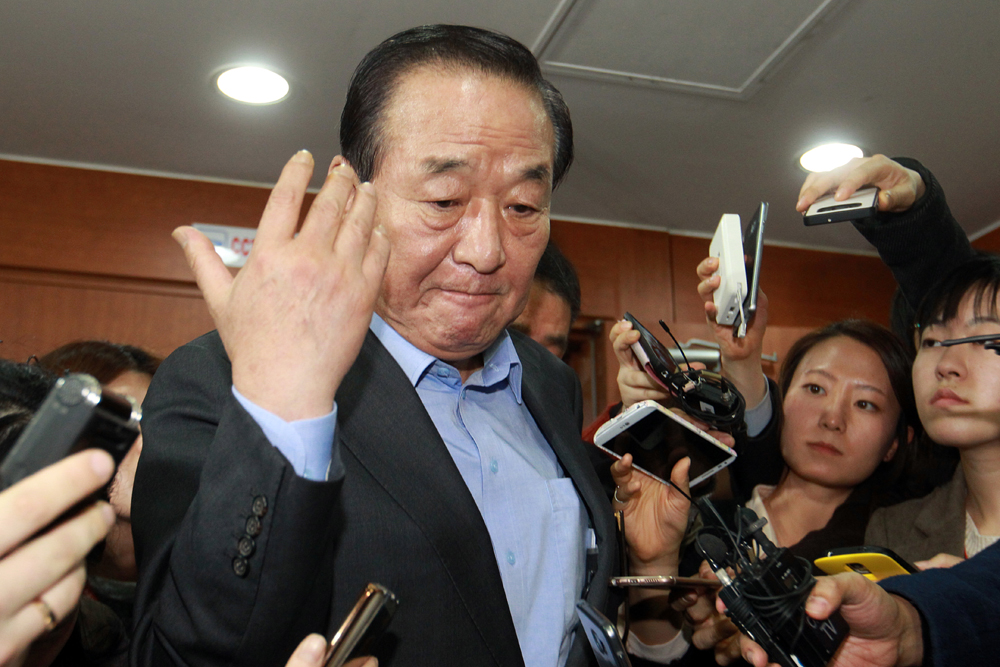 새누리당 서청원 최고위원이 25일 오후 여의도 당사에서 열린 긴급 최고위원회의를 마치고 회의장 밖으로 나서며 취재진의 질문을 받고 있다.