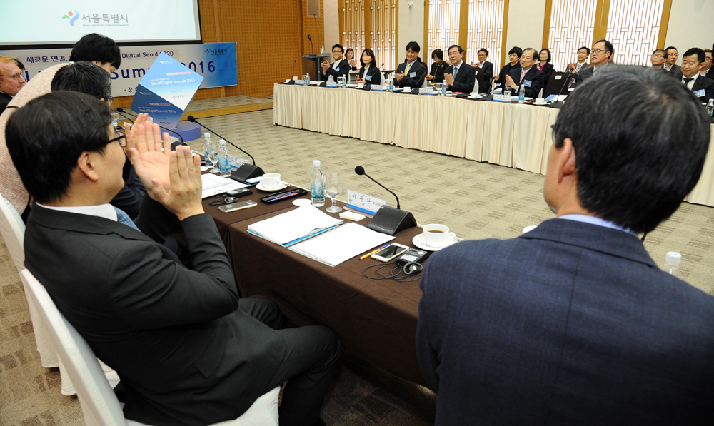 박원순 서울시장과 이상철 LG유플러스 고문 등 참석자들이 30일 오후 서울 용산구 서울파트너스 하우스에서 열린 '전략적 글로벌 민관협력을 위한 서울 디지털 서밋 2016'에서 프리젠테이션을 보고 있다. 서울시 제공
