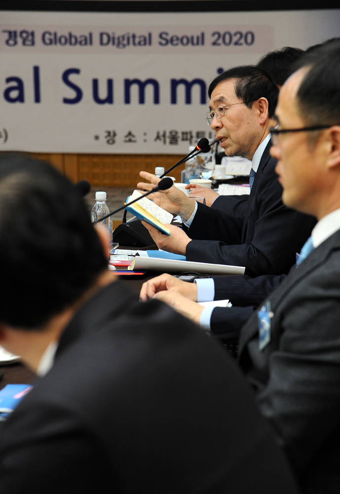 박원순 서울시장과 이상철 LG유플러스 고문 등 참석자들이 30일 오후 서울 용산구 서울파트너스 하우스에서 열린 '전략적 글로벌 민관협력을 위한 서울 디지털 서밋 2016'에서 프리젠테이션을 보고 있다. 서울시 제공