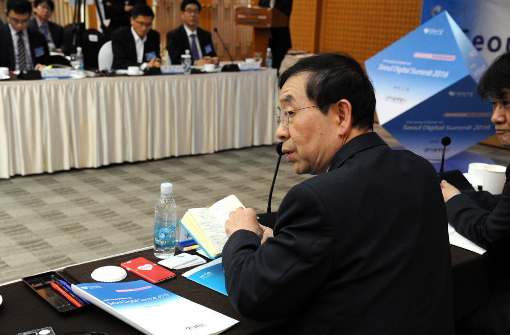 박원순 서울시장과 이상철 LG유플러스 고문 등 참석자들이 30일 오후 서울 용산구 서울파트너스 하우스에서 열린 '전략적 글로벌 민관협력을 위한 서울 디지털 서밋 2016'에서 프리젠테이션을 보고 있다. 서울시 제공