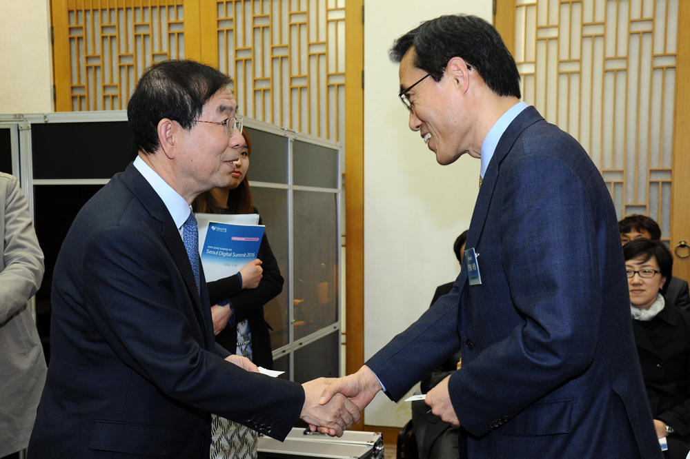 박원순 서울시장과 이상철 LG유플러스 고문 등 참석자들이 30일 오후 서울 용산구 서울파트너스 하우스에서 열린 '전략적 글로벌 민관협력을 위한 서울 디지털 서밋 2016'에서 프리젠테이션을 보고 있다. 서울시 제공
