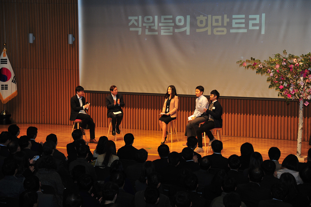 박원순 서울시장이 30일 오전 8시 서울시청에서 정례조례 후 직원들과 조직문화에 대해 토크쇼를 하고 있다. 서울시 제공