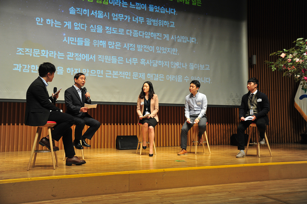 박원순 서울시장이 30일 오전 8시 서울시청에서 정례조례 후 직원들과 조직문화에 대해 토크쇼를 하고 있다. 서울시 제공