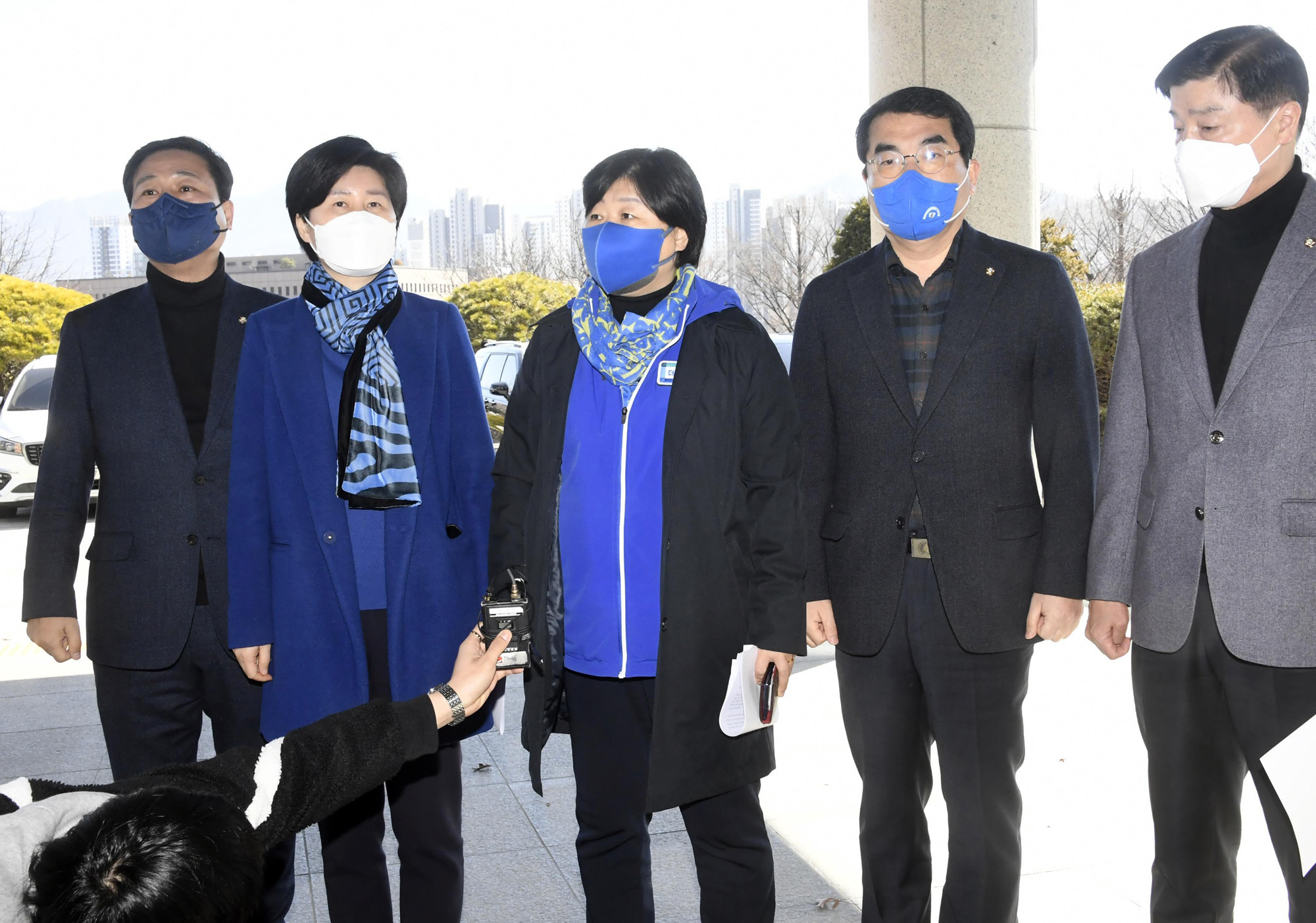 더불어민주당 서영교 행안위원장과 백혜련 선대위 수석대변인을 비롯한 더불어민주당 의원들이 6일 코로나19 재택 치료자 투표관리에 대한 재발 방지를 촉구하며 과천 중앙선관위에 항의 방문 하고 있다. 2022.03.06.