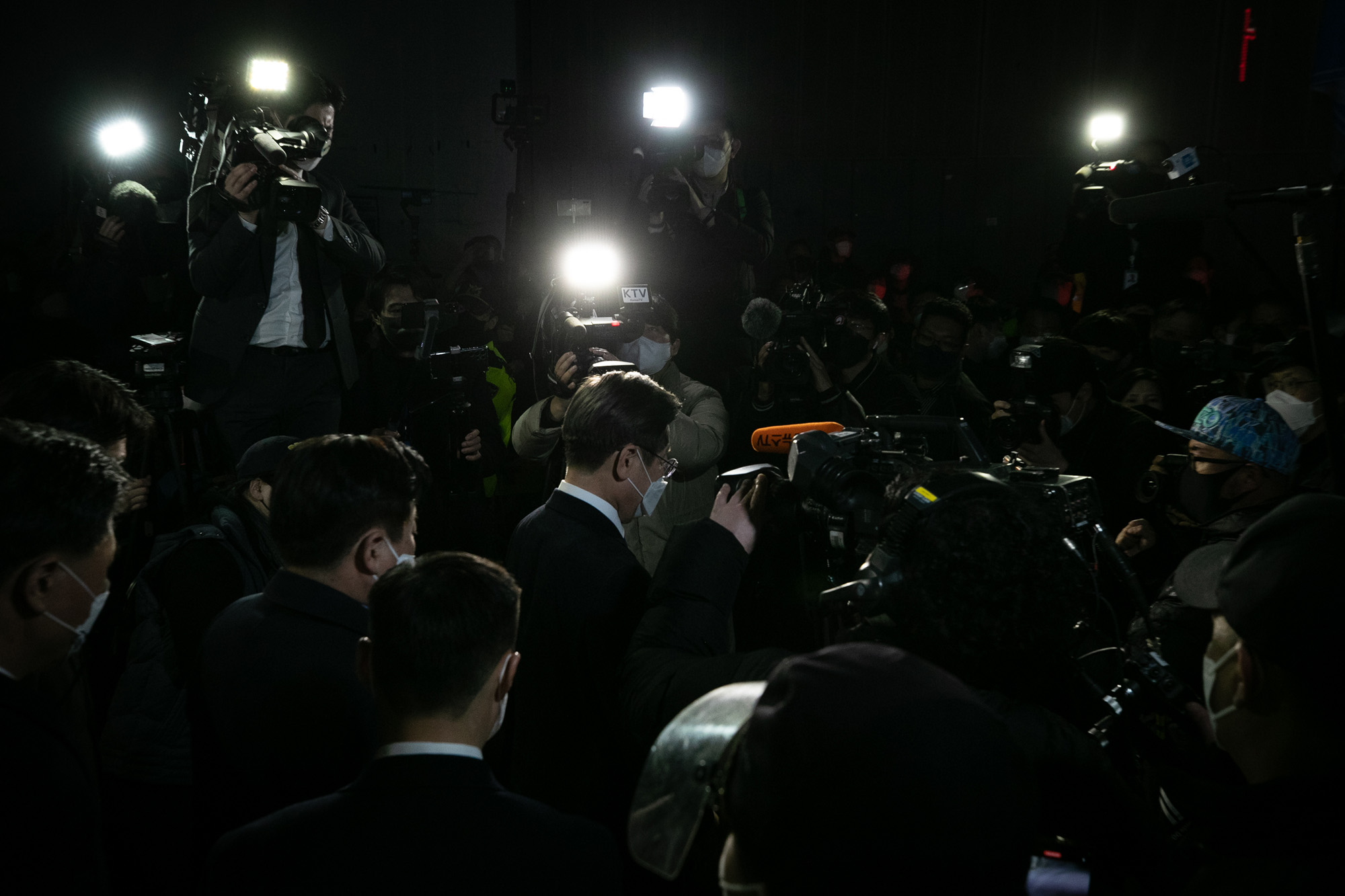 이재명 더불어민주당 대선후보가 10일 새벽 서울 여의도 더불어민주당 당사에서 열린 제20대 대통령선거 패배 승복 기자회견을 마친 후 당 관계자들의 배웅을 받으며 이동하고있다.