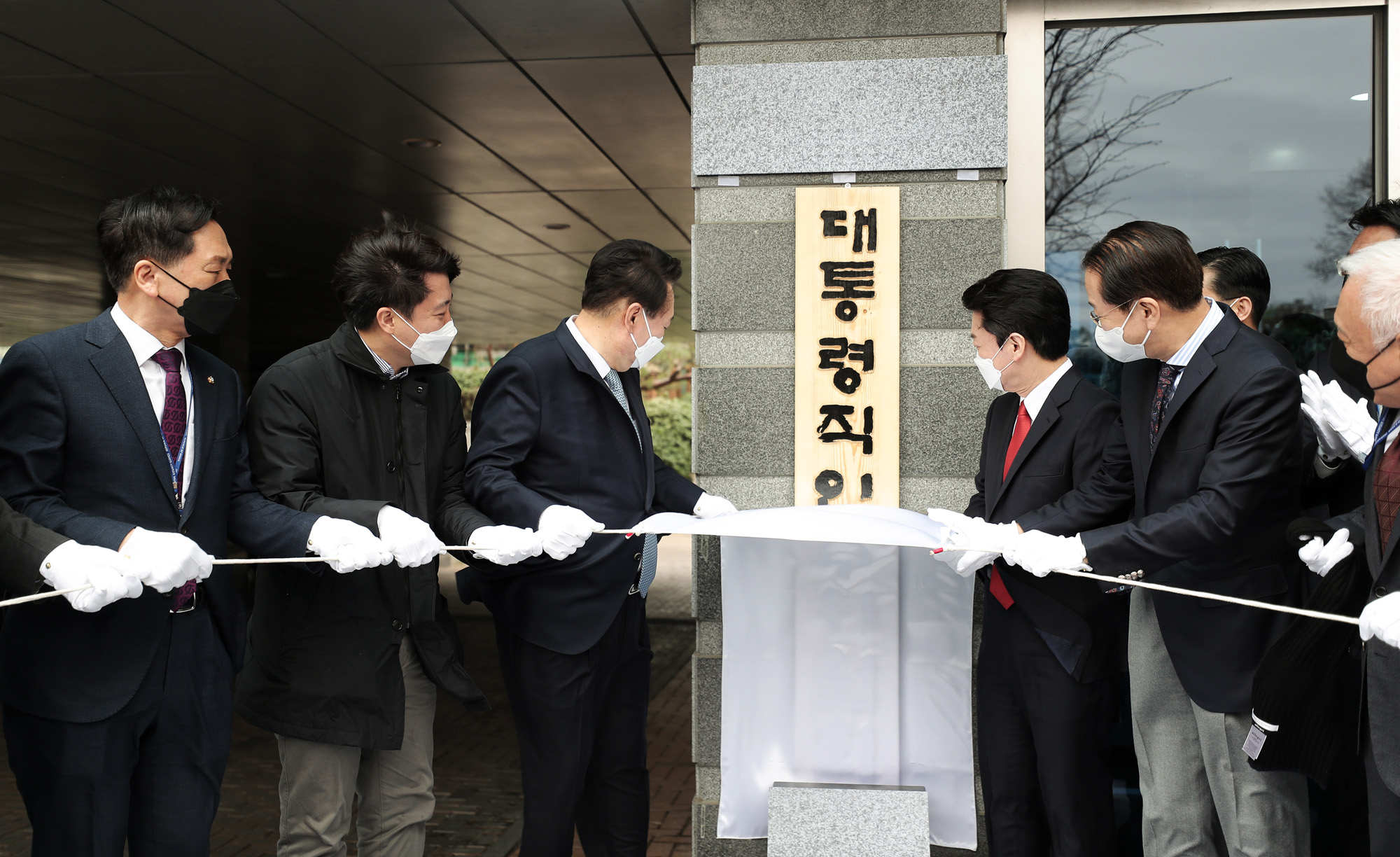 18일 통의동 인수위 사무실에서 윤석열 당선인, 안철수 인수위원장을 비롯한 인수위원들이 모여 현판식을 하고 있다.