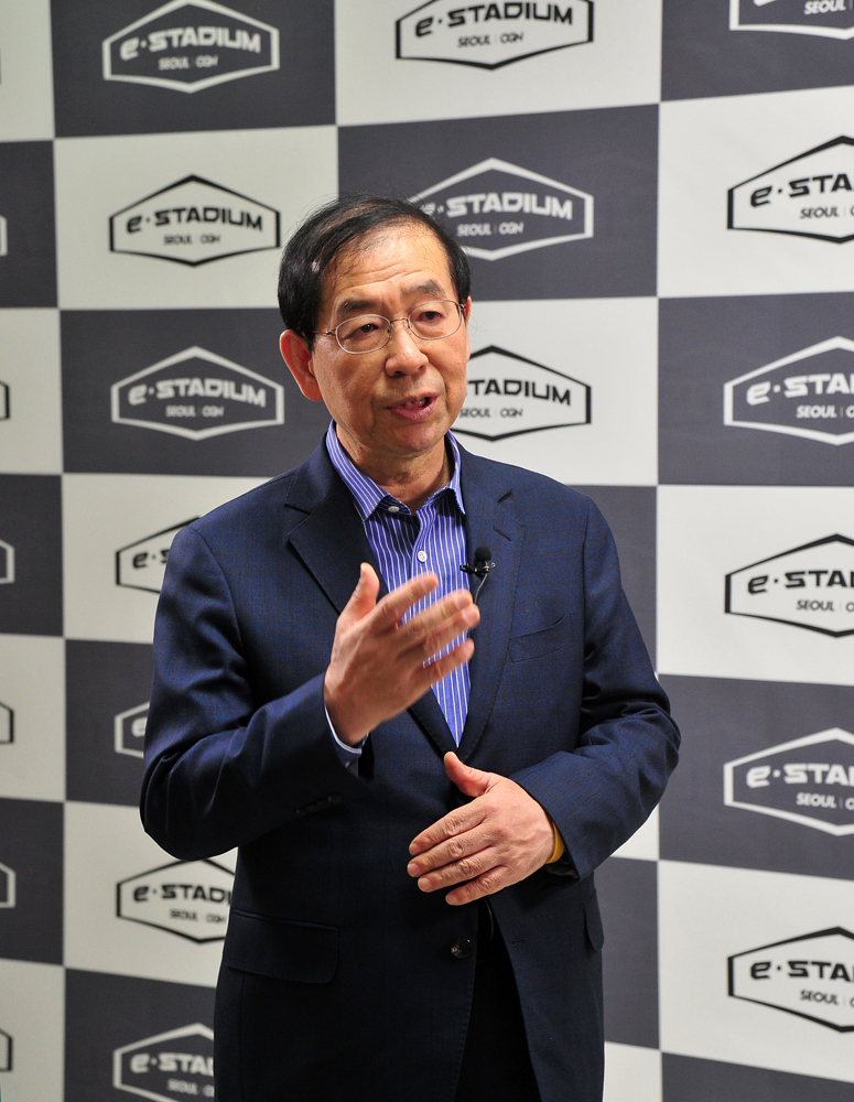박원순 서울시장은 3일 서울 송파구 올림픽공원 올림픽홀에서 열리고 있는 2016 히어로즈 오브 더 스톰 스프링 글로벌 챔피언십 현장을 찾아 블리자드의 마이크 모하임 CEO와 함께 한국대표 MVP 블랙과 중국대표 에드워드 게이밍의 결승전을 관람했다. 서울시 제공