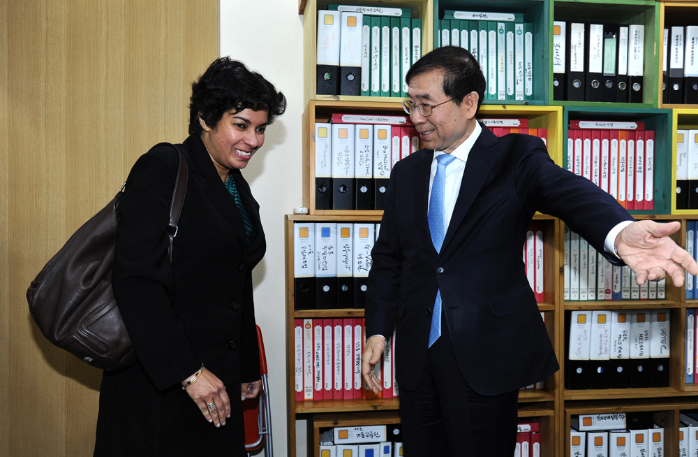 박원순 서울시장과 마니샤 구나세이카라(왼쪽) 주한스리랑카 대사가 7일 오전 서울 중구 서울시청 시장 집무실에서 면담을 나누고 있다. 서울시 제공