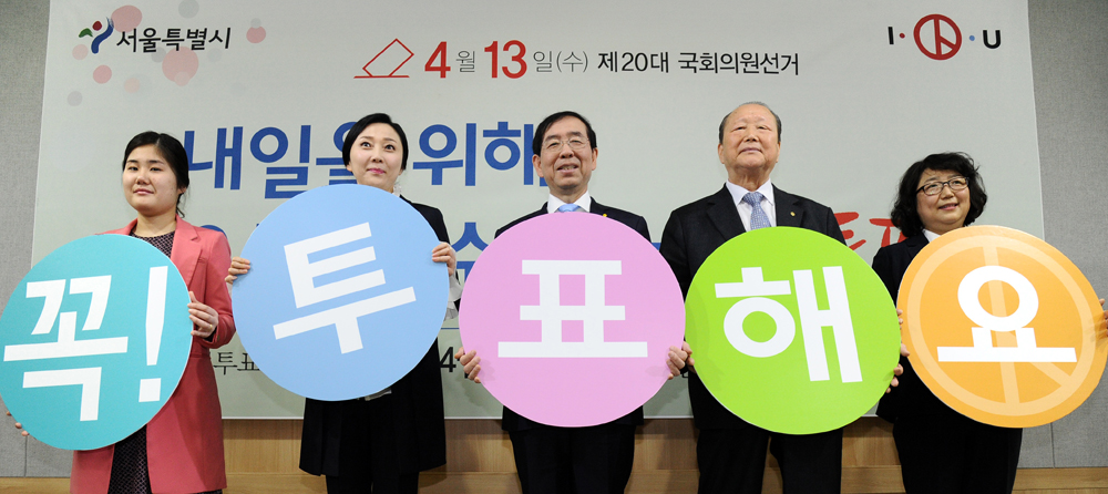 박원순 서울시장이 7일 명예부시장 3명 및 김나운 서울시 홍보대사와 함께 투표를 권장하는 브리핑을 하고 있다. 서울시 제공