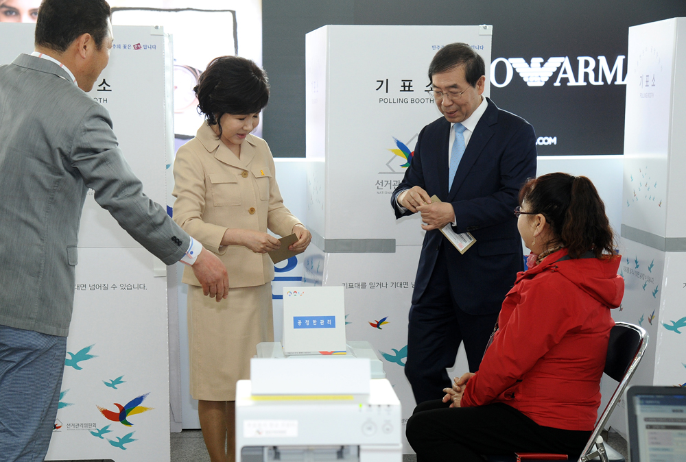 4·13 총선 사전투표 첫째날인 8일 오전 박원순 서울시장과 부인 강난희 씨가 서울 용산구 서울역 맞이방에 마련된 남영동 사전투표소에서 투표에 참여하고 있다. 서울시 제공