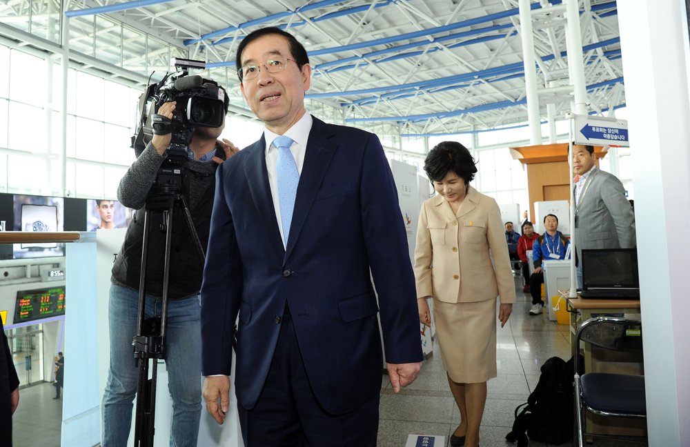 4·13 총선 사전투표 첫째날인 8일 오전 박원순 서울시장과 부인 강난희 씨가 서울 용산구 서울역 맞이방에 마련된 남영동 사전투표소에서 투표에 참여하고 있다. 서울시 제공