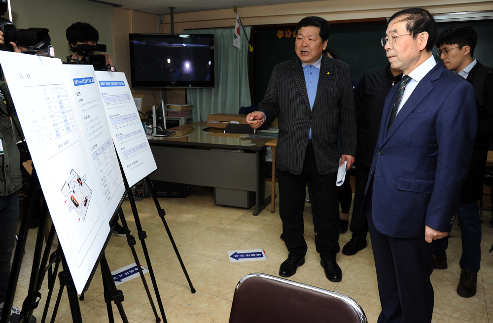 박원순 서울시장이 4.13 총선을 하루 앞둔 12일 오후 서울 종로구 재동초등학교에 설치된 투표소를 점검하고 있다. 서울시 제공