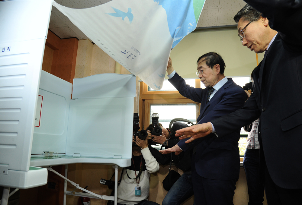 박원순 서울시장이 4.13 총선을 하루 앞둔 12일 오후 서울 종로구 재동초등학교에 설치된 투표소를 점검하고 있다. 서울시 제공