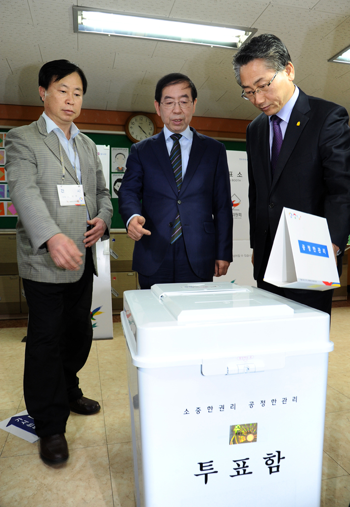 박원순 서울시장이 4.13 총선을 하루 앞둔 12일 오후 서울 종로구 재동초등학교에 설치된 투표소를 점검하고 있다. 서울시 제공