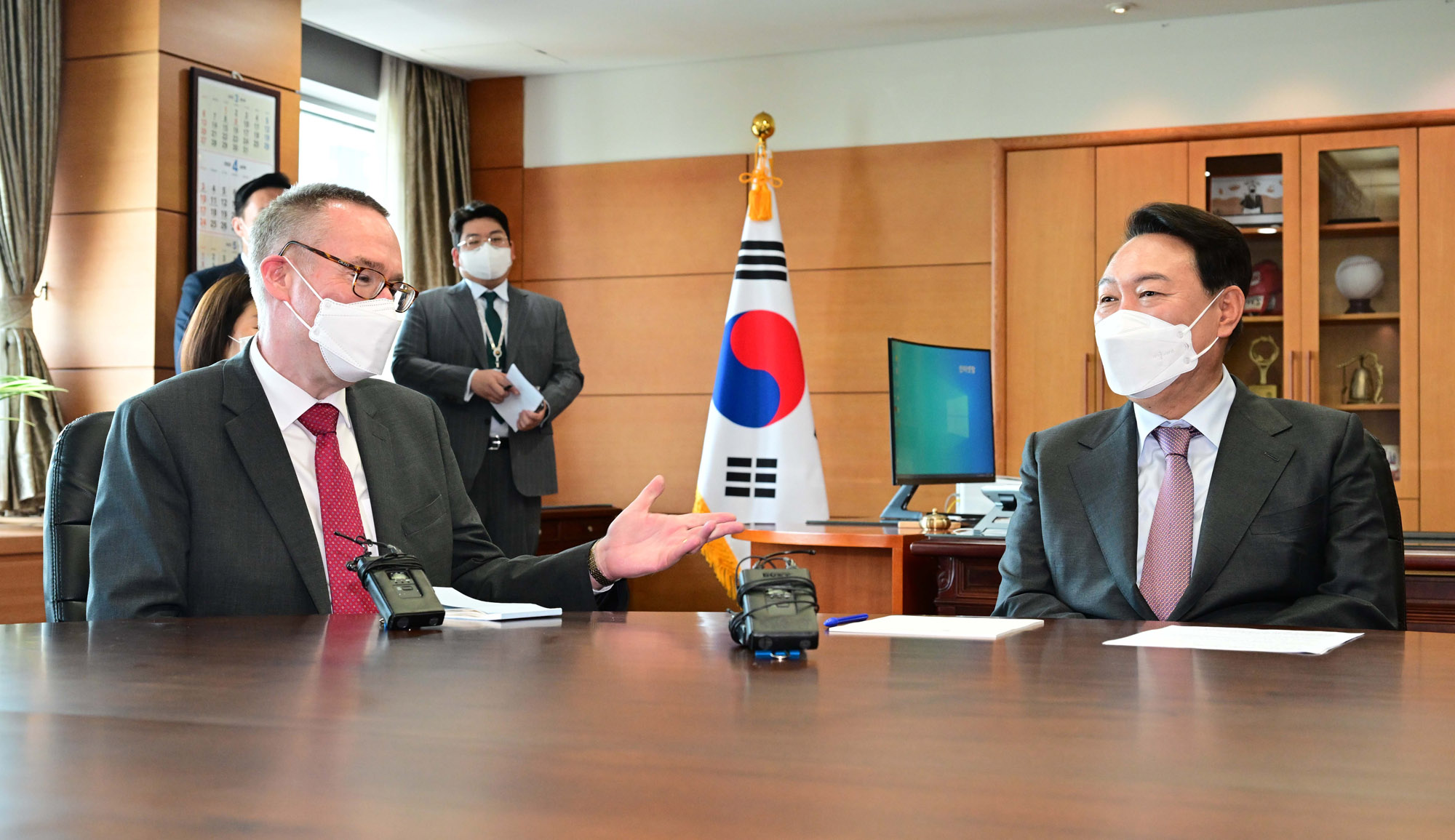 윤석열 대통령 당선인이 15일 오전 서울 종로구 통의동 대통력직인수위원회에서 콜린 크룩스 주한영국대사 내정자를 접견하고 있다.